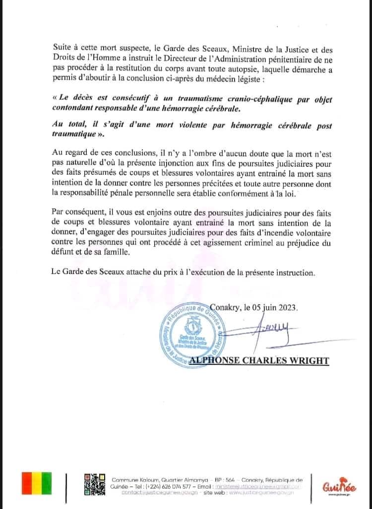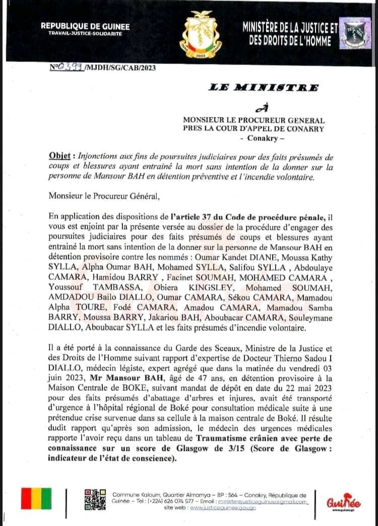 La mort suspecte en détention de Mansour BAH à la prison civile de Boké suivie de l’incendie de sa maison familiale ne resteront pas impunis. Dans une lettre d’injonction en date du 05 juin 2023, le ministre de la Justice et des droits de l’homme a ordonné des poursuites judiciaires pour des faits présumés de coups et blessures ayant entrainé la mort sans intention de la donner sur la personne de Mansour BAH en détention préventive contre plus d’une vingtaine de personnes.