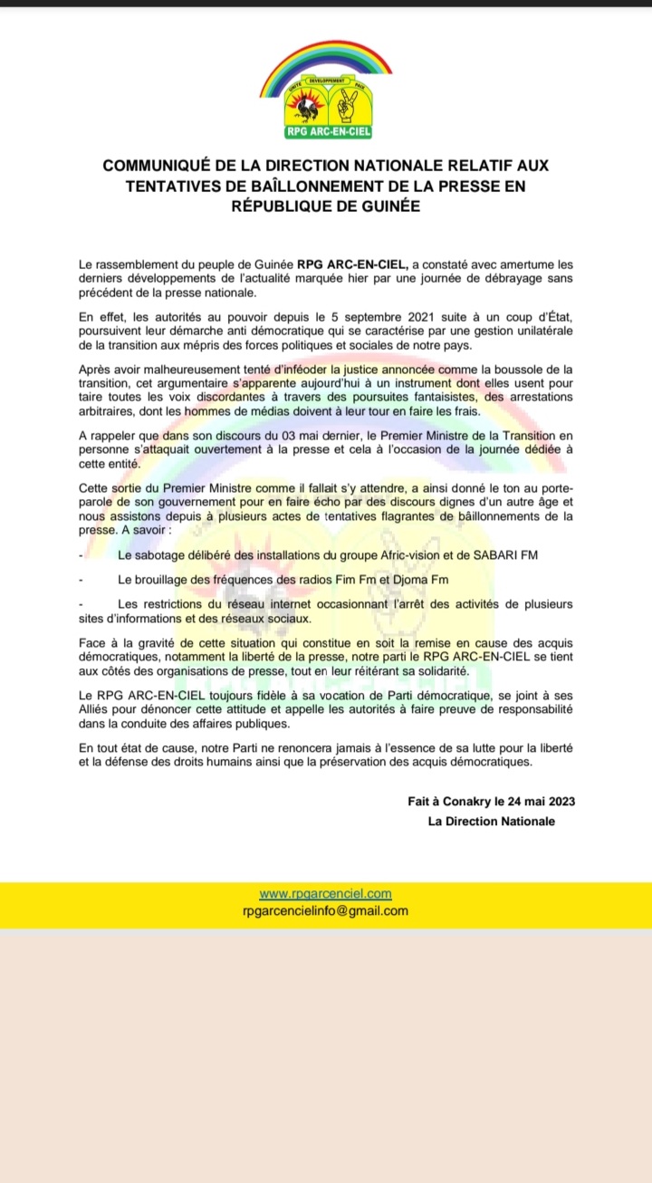 A travers un communiqué rendu public ce mercredi, 24 mai 2023, le RPG arc-en-ciel et alliés disent constater avec amertume les derniers développements de l’actualité guinéene, notamment aux actions et discours du gouvernement de la transition tendant à « bâillonner la liberté de la presse et à censurer des médias guinéens ».