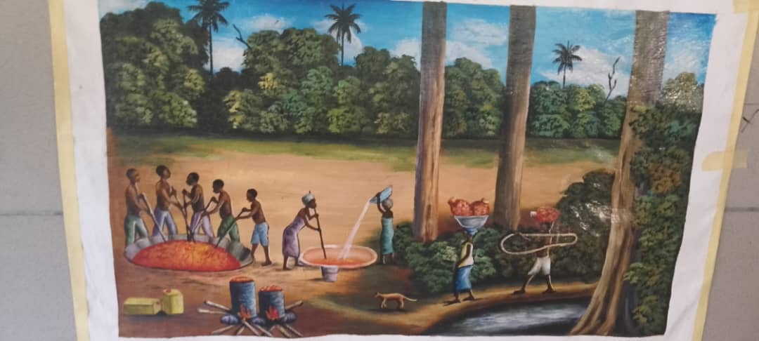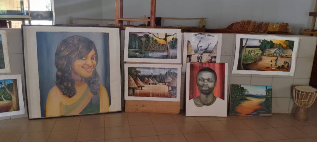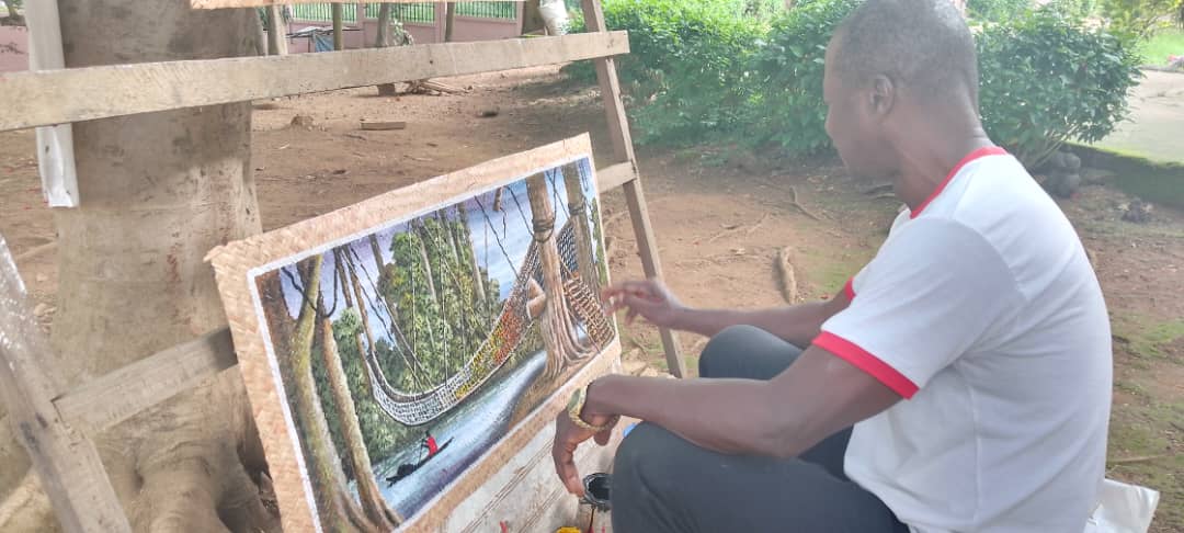 Hormis ses années de début, Antony a aujourd’hui plus d’une vingtaine d’années d’expérience professionnelle dans la peinture et de la décoration. Une fois dans l’enceinte du centre artisanal de N’zérékoré, ce sont les tableaux d’Antony que nous apercevons en premier lieu. Floqués sur les murs ou accrochés ou adossés à d’autres supports, ces tableaux émanent d’une véritable inspiration sans ambage de l’artiste.