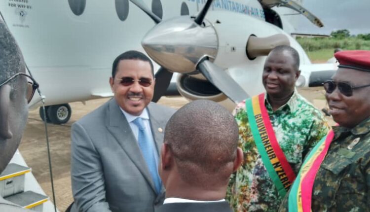 C’est à 10h45 minutes que le ministre de la Santé et de l’Hygiène Publique a été accueilli à l’aérodrome de N’zérékoré par une forte mobilisation des autorités administratives à leur tête le Gouverneur Lamine Kéïta, des forces de défense et de sécurité, conduite par le Commandant de la 4ème région militaire, le Colonel Damaoulén Dioumessy et les représentants des institutions onusiennes et autres structures oeuvrant dans le secteur de la santé.