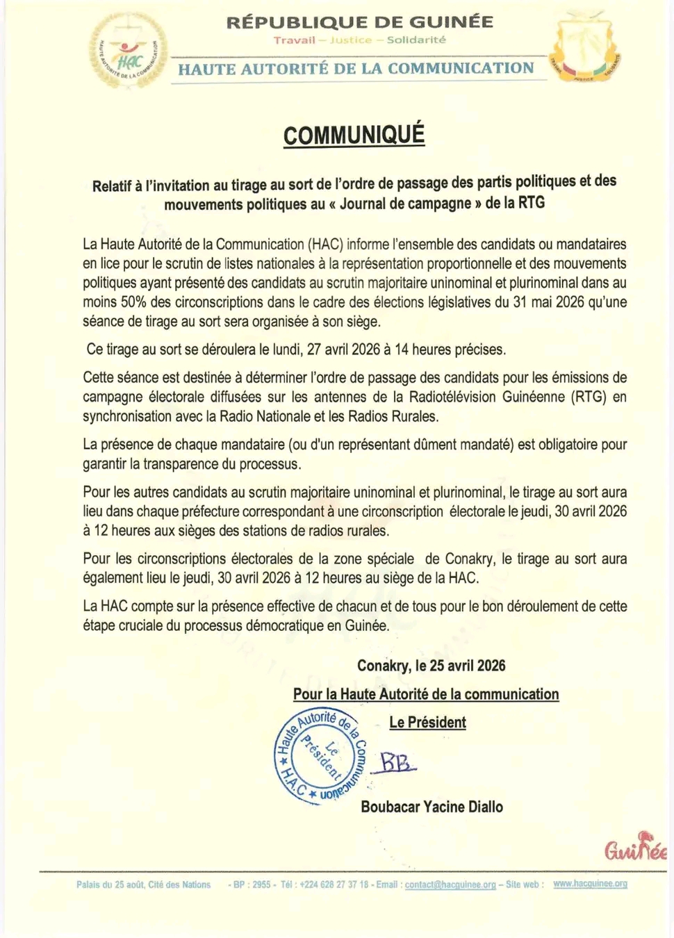 A quelques jours de l’ouverture officielle de la campagne électorale relative aux élections législatives et communales du 31 mai 2026, la Haute Autorité de la Communication (HAC) s’attelle à réglementer celle-ci dans les médias du service public. Dans un communiqué rendu public ce samedi, 25 avril 2026, la HAC annonce le tirage au sort relatif à l’ordre de passage des partis et mouvements politiques dans le « journal de campagne » de la RTG. Ce lundi, 27 avril 2026, les partis politiques en lice pour les législatives (listes nationales à la représentation proportionnelle) seront tirés au sort.