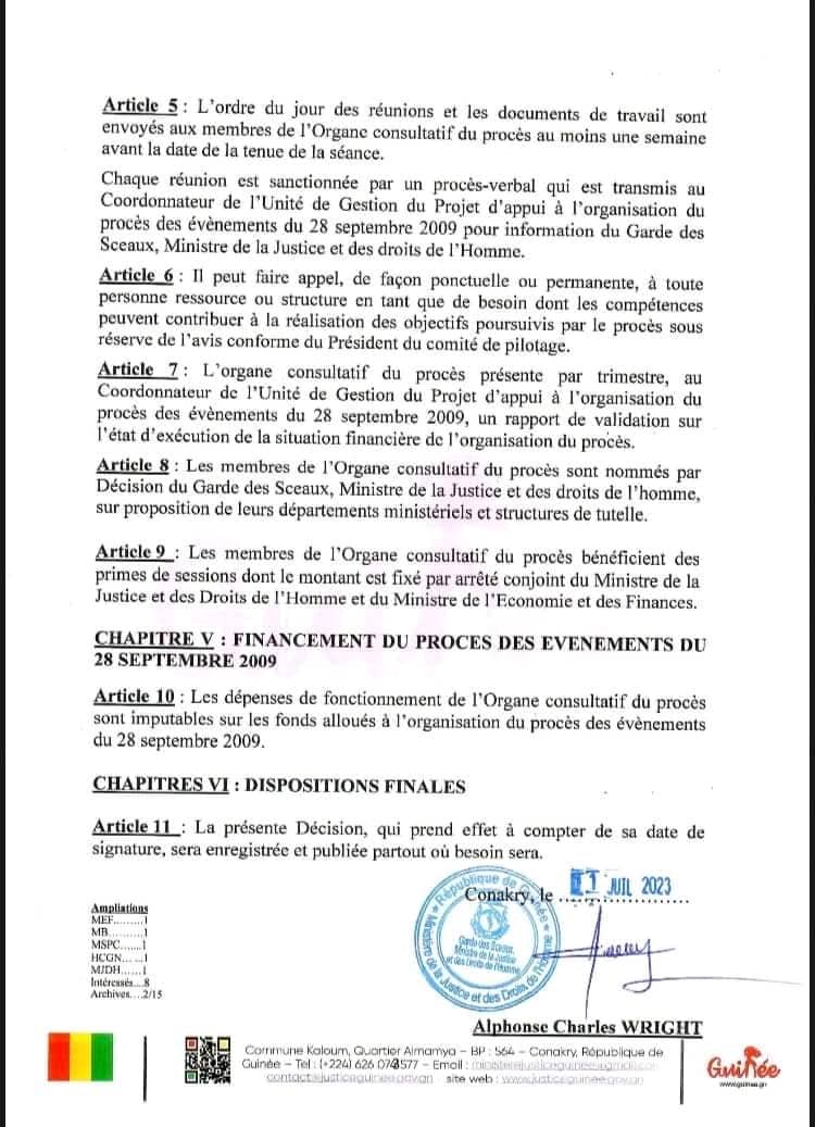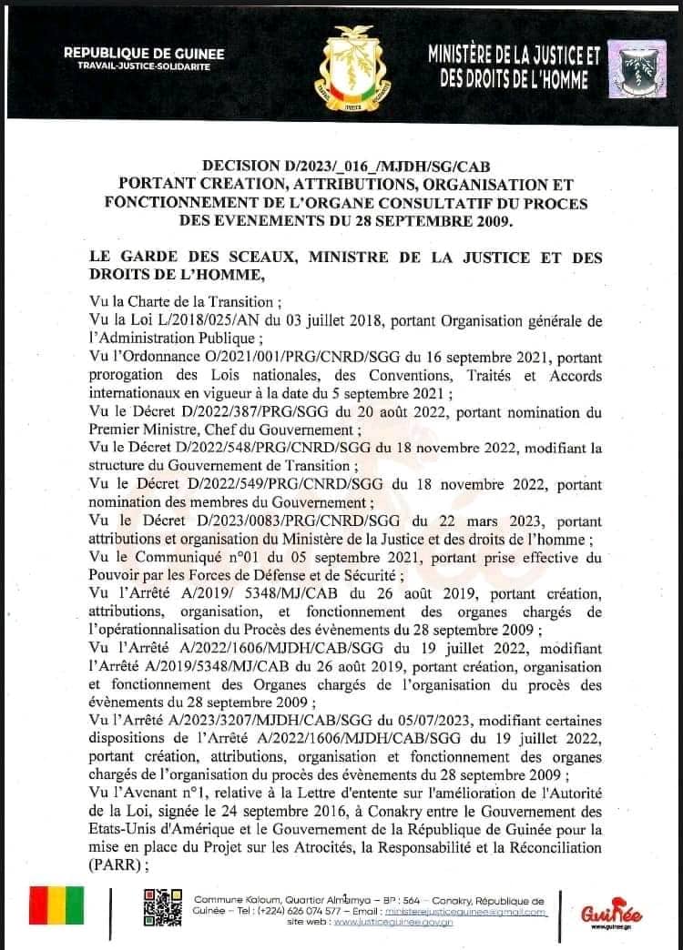 A travers une décision en date du 11, juillet 2023, le Garde des Sceaux ministre de la Justice et des droits de l’homme a procédé à la création d’un Organe consultatif du procès des évènements du 28 septembre 2009. Il est placé sous l’autorité du Coordonnateur de l’Unité de Gestion du Projet d’appui à l’organisation du Procès des évènements du 28 septembre.