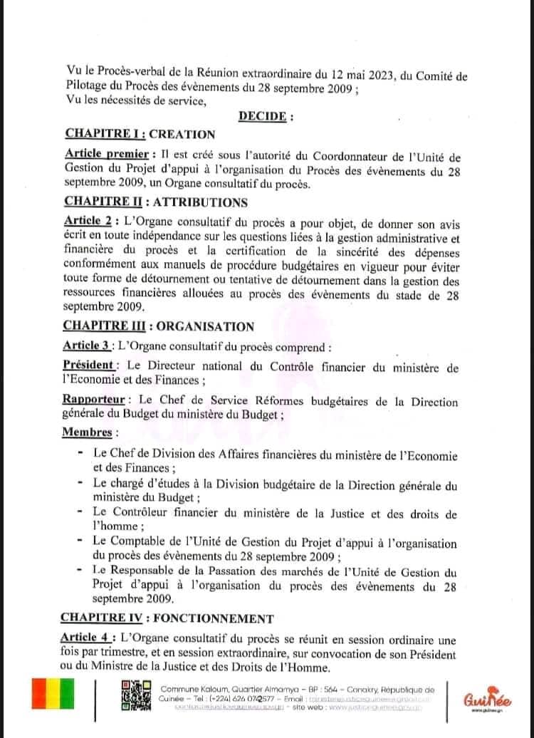 Selon l’article 2 de cette décision, l’Organe consultatif du procès a pour objet, de donner son avis écrit en toute indépendance sur les questions liées à la gestion administrative et financière du procès et la certification de la sincérité des dépenses conformément aux manuels de procédure budgétaires en vigueur pour éviter toute forme de détournement ou tentative de détournement dans la gestion des ressources financières allouées au procès des évènements du stade de 28 septembre 2009.