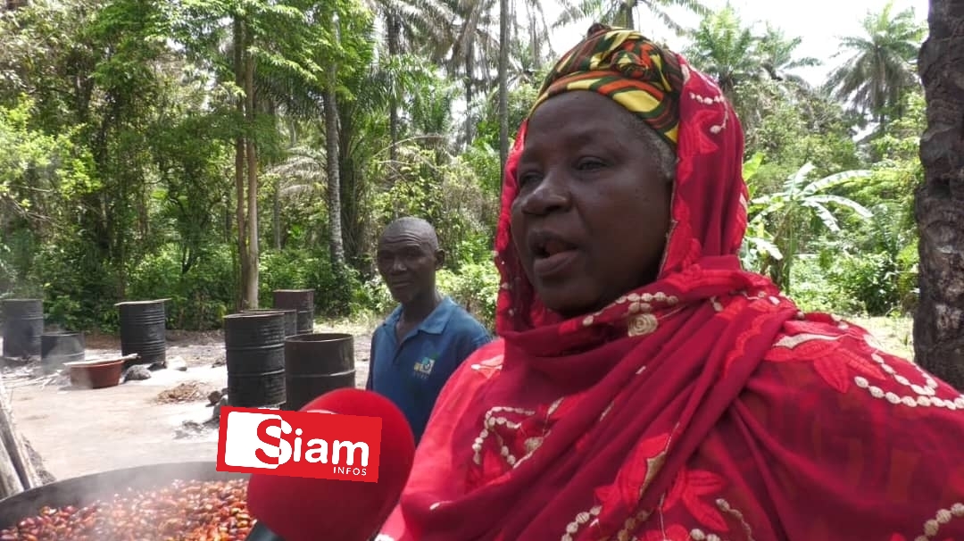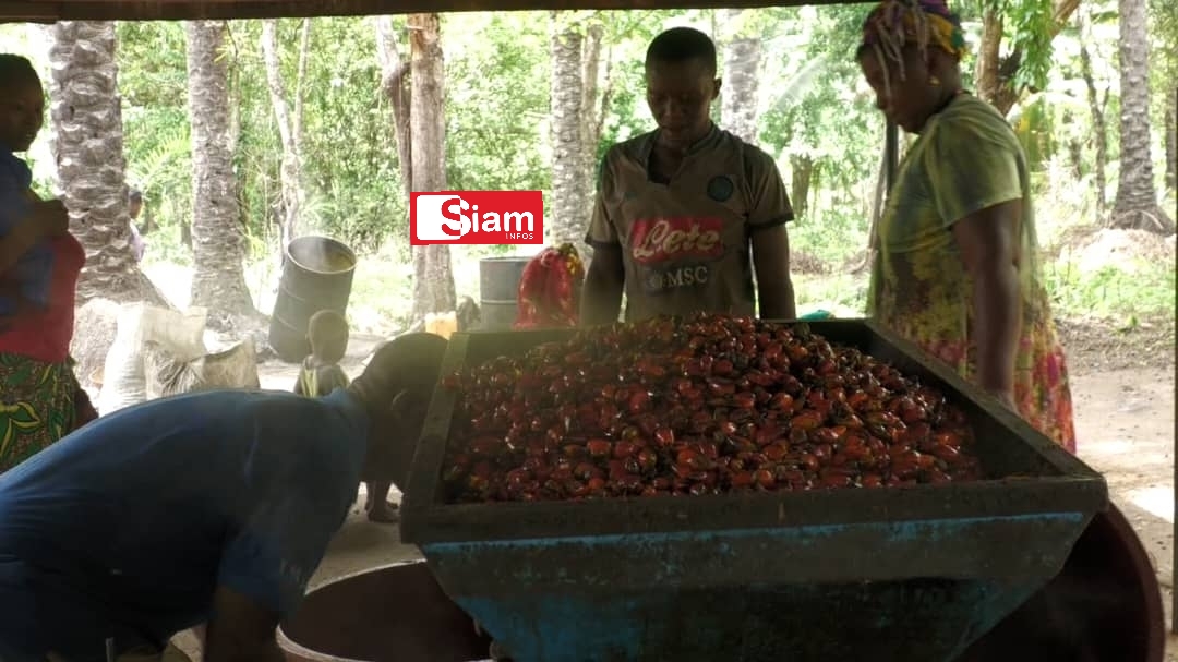 « D’abord, il faut couper les régimes de palmistes quand ils arrivent à maturité. Puis, vous les laissez dans un endroit humide et après il faut séparer les noix au reste du régime. Ainsi, vous les mettez sous le soleil pendant quelque temps. Ensuite, dans les barils pour préparation pendant de longues heures et après vous les déversez dans la machine pour piler mécaniquement. Cela va permettre de séparer les coques de l’amande. Là, vous obtiendrez un liquide jaune grâce au tamis qui devra être reversé dans les barils pour bouillir. Et dans ce processus, vous verrez l’huile se séparer de l’eau au fur et à mesure. C’est à partir de là qu’il faut utiliser une calebasse pour récupérer le produit fini. Voilà comment nous faisons pour produire l’huile de palme ici», a-t-il expliqué.