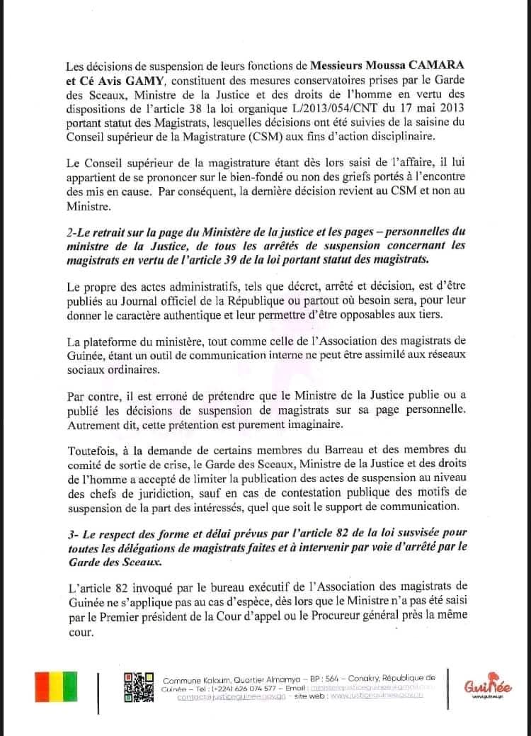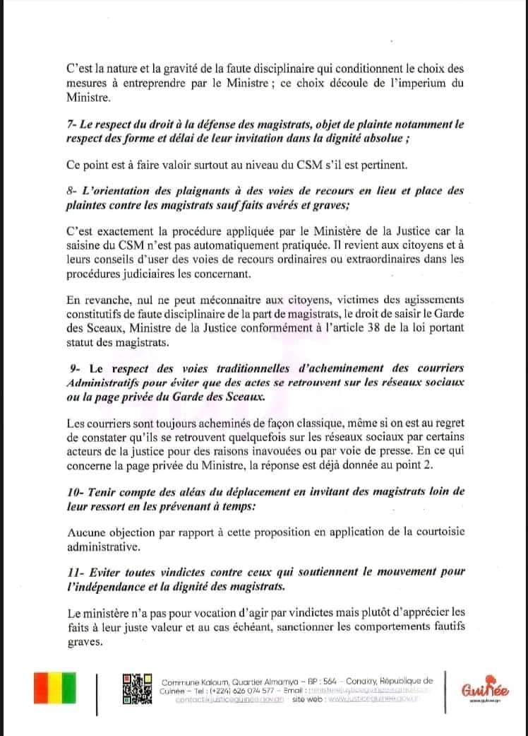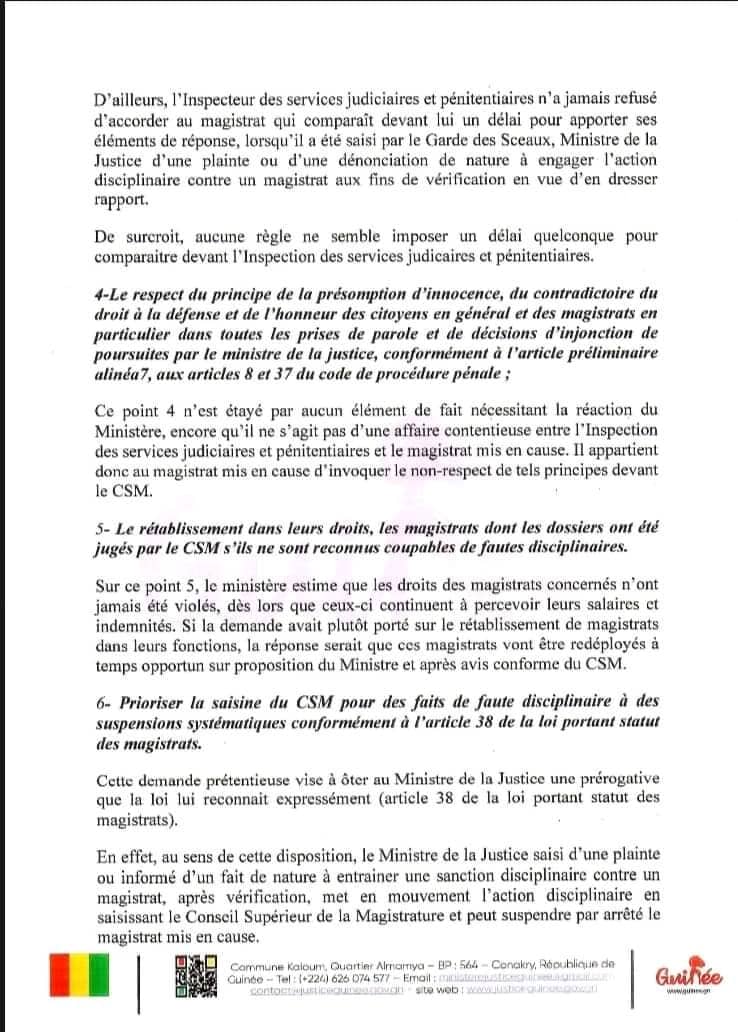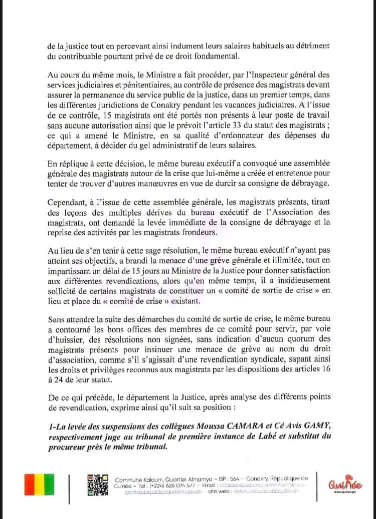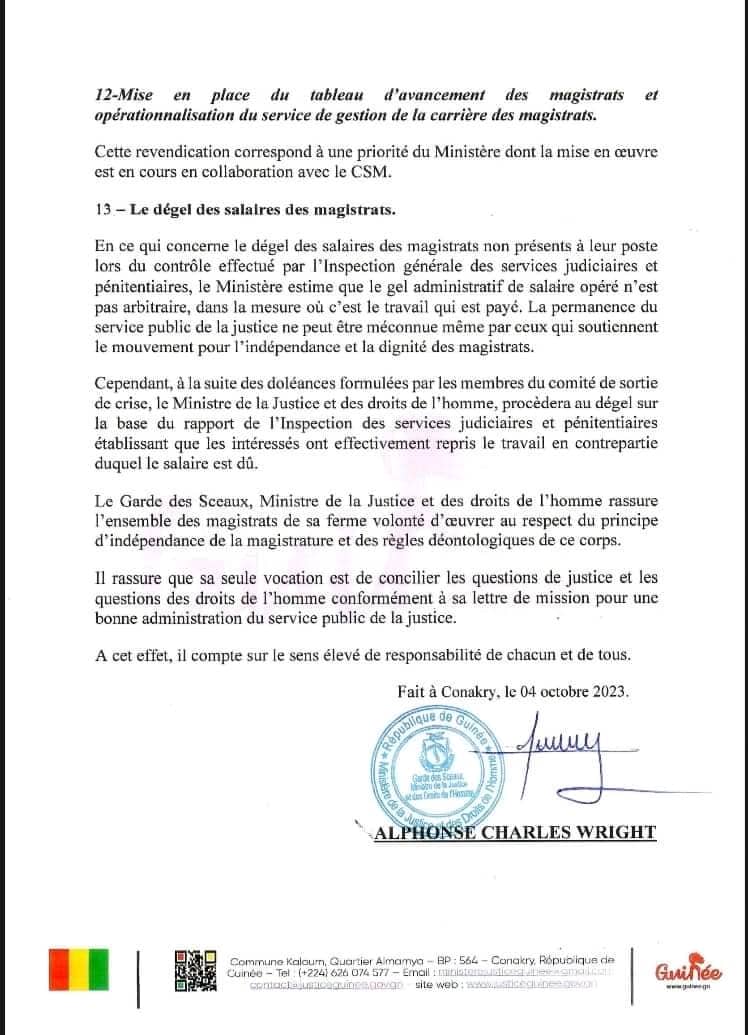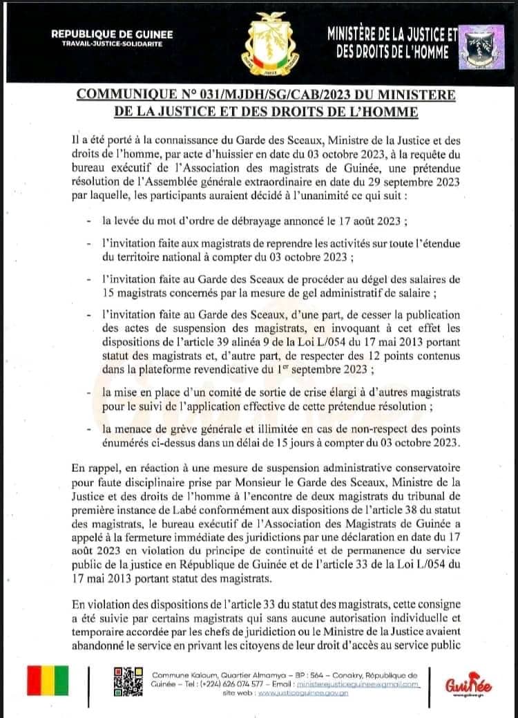 Dans un communiqué rendu public ce 04 octobre 2023, le ministre de la Justice et des droits de l’homme a apporté sa réponse à la plateforme revendicative des magistrats de Guinée réunis au sein de l’Association des Magistrats de Guinée (AMG).