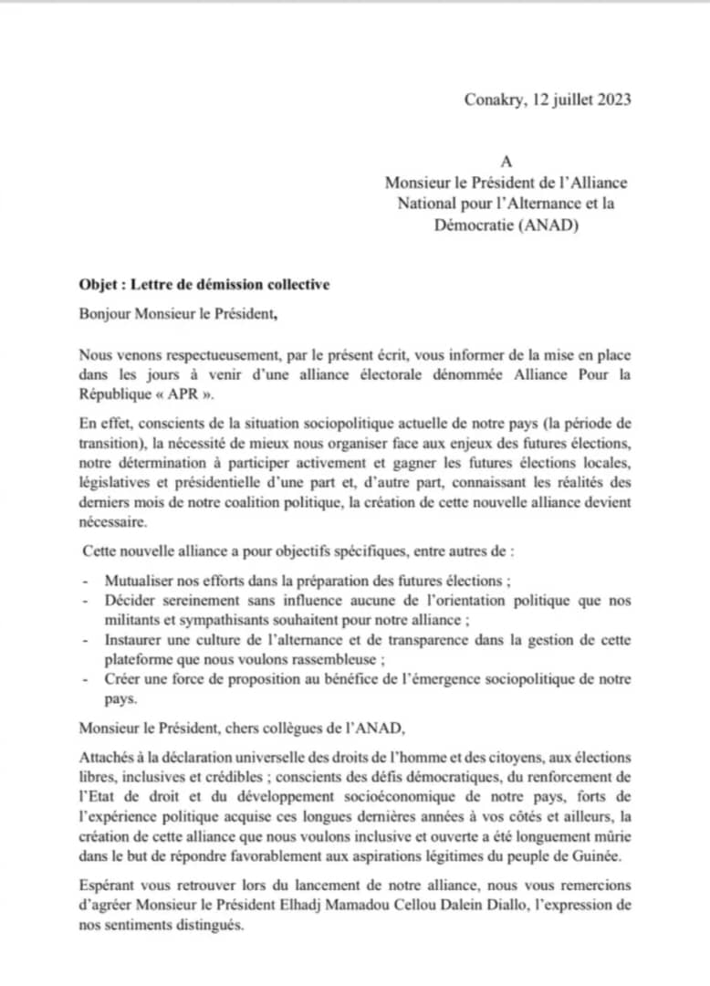 A travers un courrier en date du 12, juillet 2023, sept (7) partis politiques membres de l’ANAD ont informé Cellou Dalein Diallo de leur démission collective de la coalition politique, mais aussi de la mise en place dans les jours à venir d’une alliance électorale dénommée Alliance Pour la République « APR ».