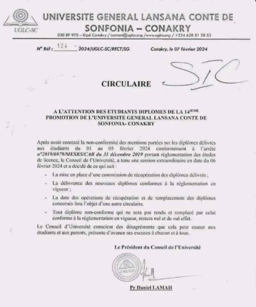 Pour ce faire, le conseil de l’université Général Lansana Conté présidé par le recteur Daniel Lamah, a mis en place une commission de récupération des diplômes délivrés et la délivrance de nouveaux diplômes conformes à la réglementation en vigueur.