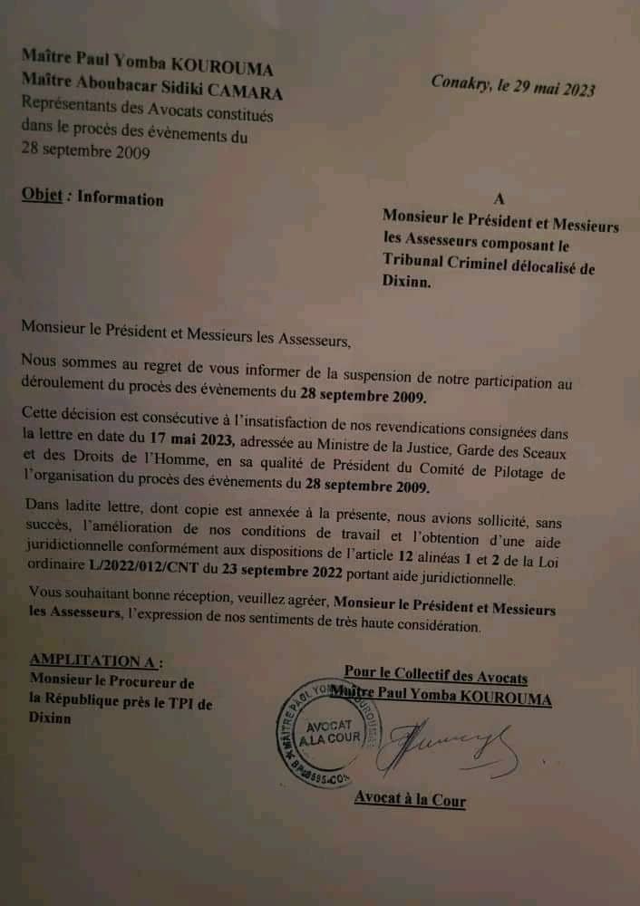 Les avocats constitués dans le dossier du massacre du 28 septembre 2009 décident de passer à la vitesse supérieure. Comme annoncé dans un courrier en date du 17 mai 2023 adressé au ministre de la Justice, ces hommes en robe noire ont décidé, à partir de ce lundi, 29 mai 2023, de suspendre leur participation au procès des évènements du 28 septembre.