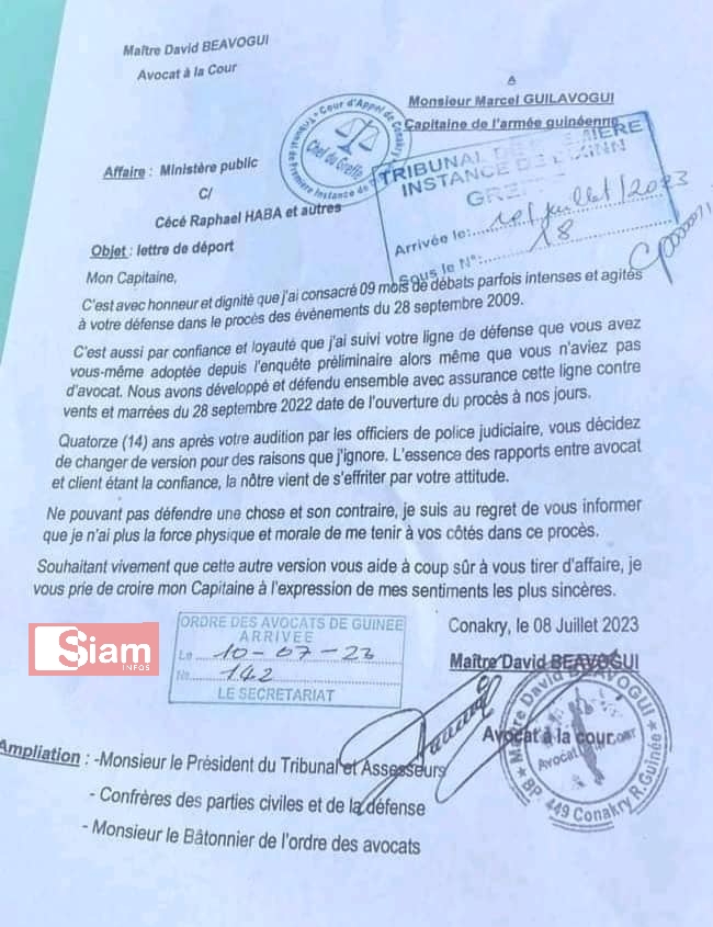 A noter que ce retrait de l’avocat de Marcel Guilavogui intervient au moment où le Capitaine Moussa Dadis Camara a porté plainte contre son coaccusé pour « tentative de chantage ».