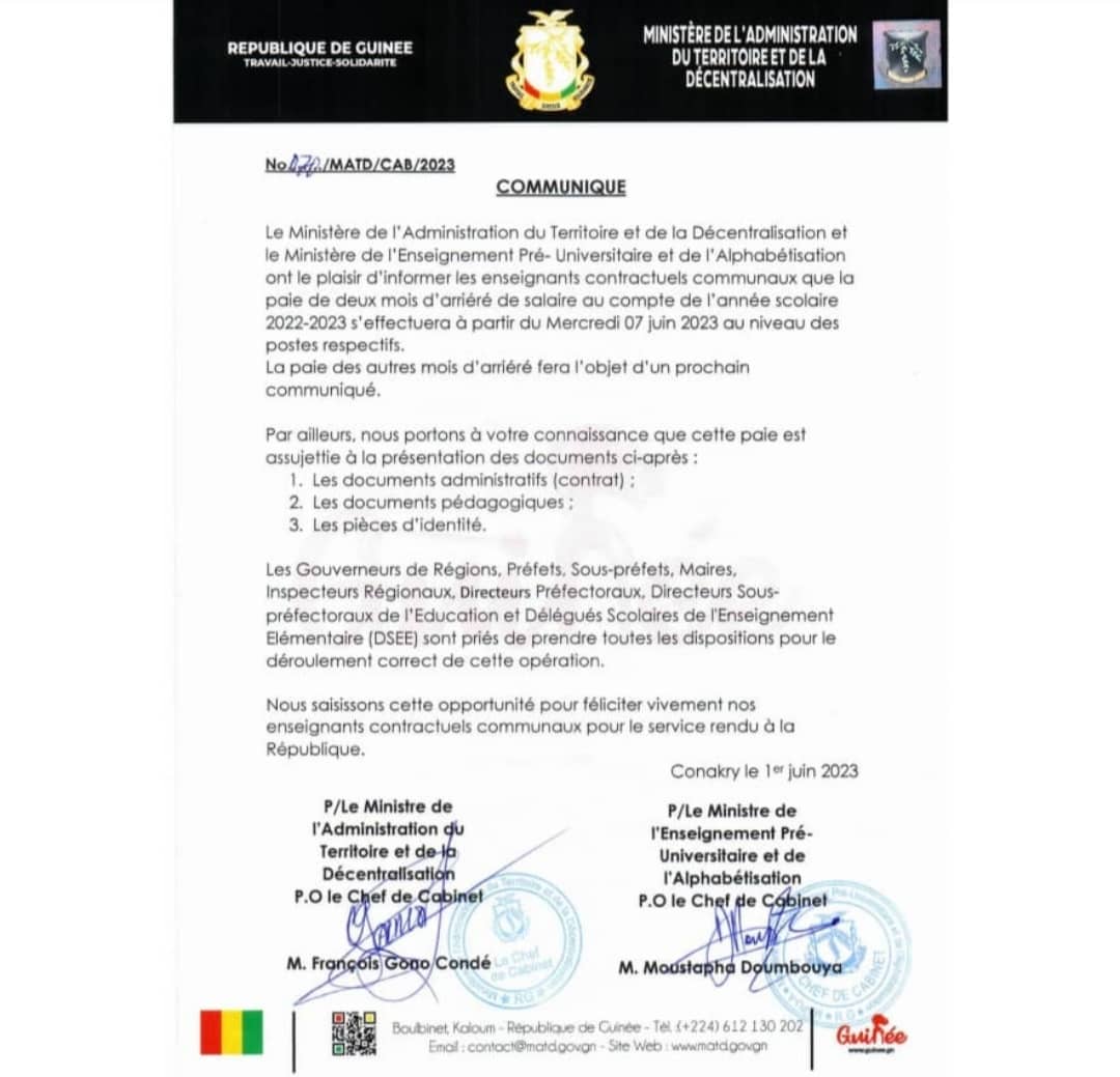 Par ailleurs, le communiqué indique que la paie des autres mois d’arriérés fera l’objet d’un autre communiqué.