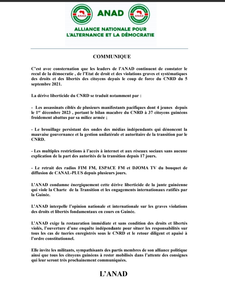 Dans un communiqué parvenu au desk de Siaminfos.com, l’Alliance nationale pour l’alternance et la démocratie (ANAD), a dénoncé la violation des droits humains et la restriction de la liberté de la presse en Guinée. Selon l’ANAD, il s’agit d’une « dérive liberticide » de la junte guinéenne. La coalition dirigée par Cellou Dalein Diallo se dit consternée par cette pratique et exige immédiatement le rétablissement des droits et libertés consacrés dans la charte de la transition. Ci-dessous, ledit communiqué !