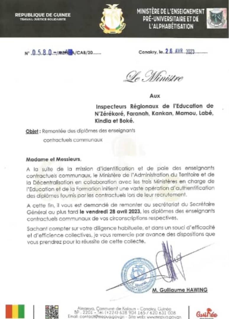 Dans une circulaire dont une copie est parvenue à la rédaction de siaminfos.com ce 27 avril 2023, le ministre de l’Enseignement Pré-universitaire et de l’Alphabétisation a demandé aux inspecteurs régionaux de l’éducation de N’zérekoré, Faranah, Kankan, Mamou, Labé, Kindia et Boké de remonter les diplômes de ces enseignants contractuels communaux, au plus tard ce vendredi 28 avril, 2023.