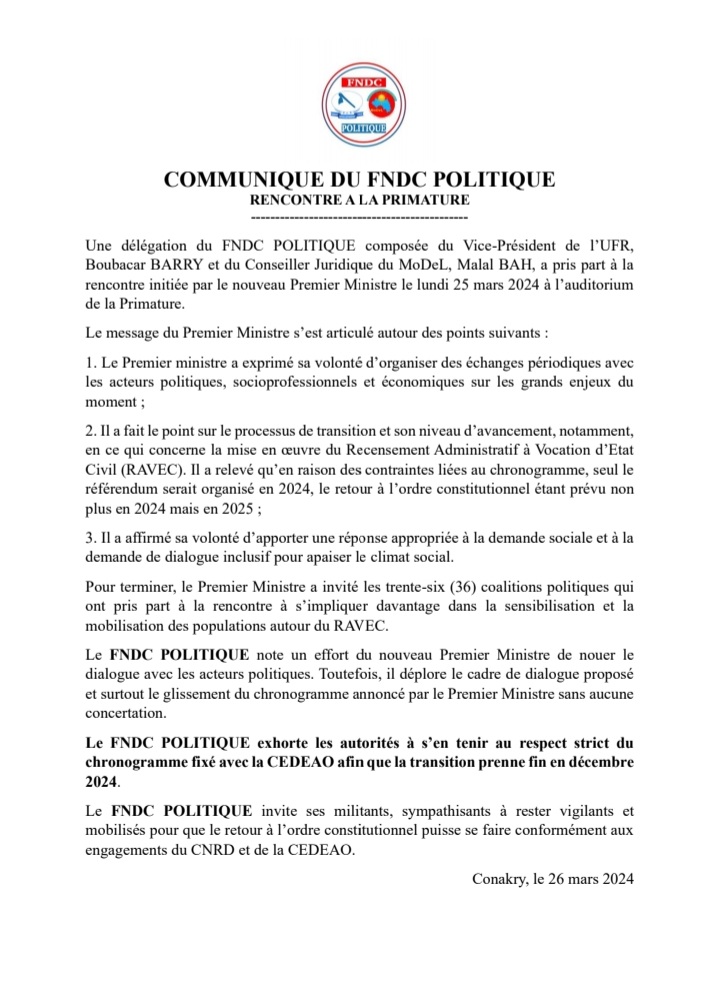 Rencontre avec le Bah Oury : le FNDC politique déplore « le cadre de dialogue proposé et surtout le glissement du chronogramme annoncé par le Premier Ministre sans aucune concertation » (Communiqué)