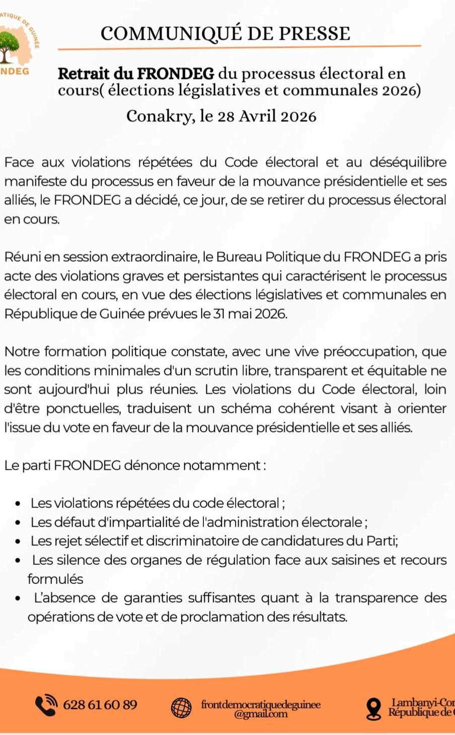 Dans un communiqué rendu public ce mardi, 28 avril 2026, le Front Démocratique de Guinée (FRONDEG), annonce son retrait des élections législatives et communales du 31 mai prochain. Le parti dirigé par l’ancien ministre de l’Enseignement Supérieur Abdoulaye Yero Baldé motive sa décision par les « violations » répétées du Code électoral, le « rejet sélectif et discriminatoire » de candidatures du FRONDEG. Dans ledit communiqué, le parti précise que ce retrait n’est pas synonyme de renoncement encore moins d’abandon, mais « l’expression d’une exigence démocratique », invitant les partenaires du pays « assumer pleinement leurs responsabilités. »