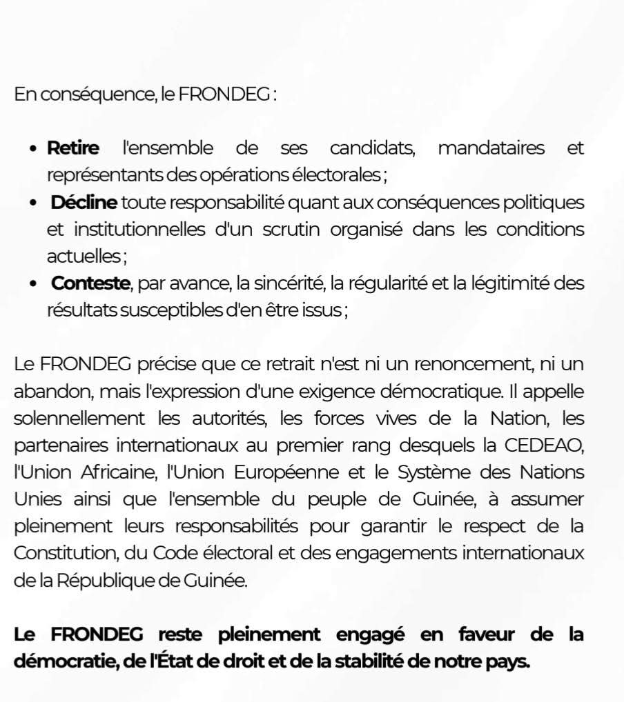 Retrait du FRONDEG du processus électoral : le parti invite les partenaires internationaux à « assumer pleinement leurs responsabilités… »