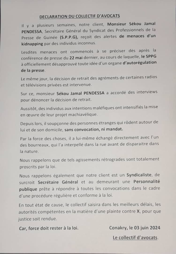 Dans une déclaration rendue publique ce 03 juin , ses avocats rappellent que Sékou Jamal Pendessa est un Syndicaliste, de surcroit Secrétaire Général et au demeurant une Personnalité publique prête à répondre à toutes les convocations dans le cadre d’une procédure régulière et conforme à la loi.