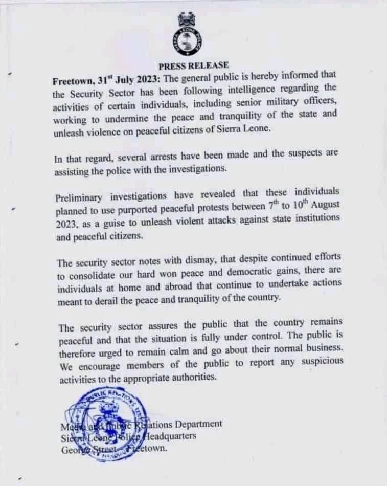 Freetown, le 31 juillet 2023 : Le grand public est informé par la présente que le secteur de la sécurité a suivi des renseignements concernant les activités de certaines personnes, y compris des officiers supérieurs de l’armée, qui s’emploient à saper la paix et la tranquillité de l’État et à déchaîner la violence contre des citoyens pacifiques de la Sierra. Léone.