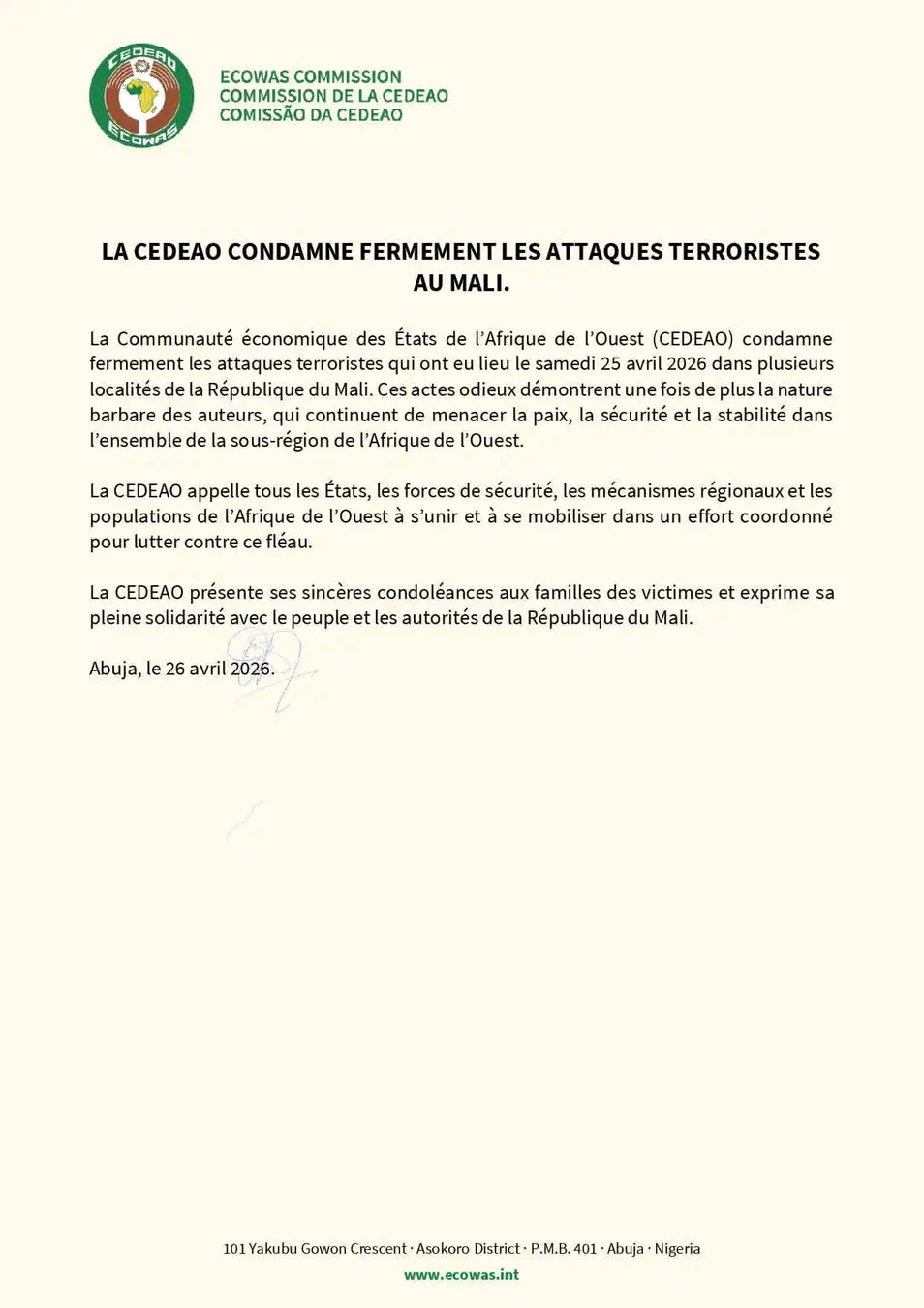 Vraisemblablement, le Mali a connu samedi, 25 avril 2026, des attaques terroristes sans précédent. En effet, plusieurs villes stratégiques du pays ont été le théâtre de violents affrontements au cours desquels, le ministre de la Défense malien Général Sadio Camara a été blessé, avant de rendre l’âme à l’hôpital. Dans un message publié ce dimanche, 26 avril 2026, la Communauté Économique des États de l’Afrique de l’Ouest (CEDEAO), a condamné fermement ces attaques terroristes. Selon la CEDEAO, ces attaques « menacent la paix, la sécurité et la stabilité » dans l’ensemble de la sous-région de l’Afrique de l’Ouest. L’institution appelle les forces ouest-africaines à s’unir et à se mobiliser pour lutter contre le terrorisme.