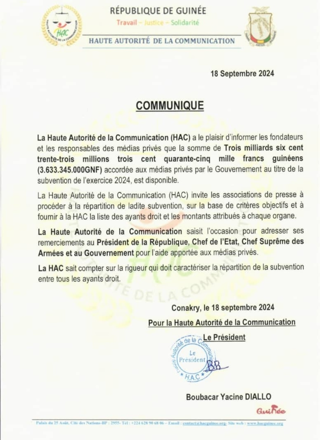 L’annonce a été faite ce mercredi, 18 septembre 2024, par le président de la Haute Autorité de la Communication (HAC). Dans son communiqué dont Siaminfos.com détient copie, Boubacar Yacine Diallo indique la subvention de plus de 3 milliards de francs guinéens accordée aux médias privés du pays, est maintenant disponible.