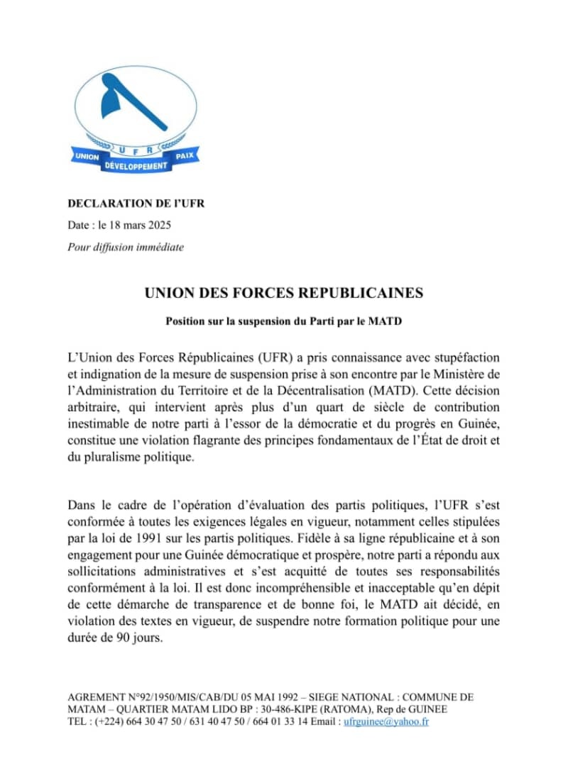 Dans le cadre de l’opération d’évaluation des partis politiques, précise le parti, «l’UFR s’est conformée à toutes les exigences légales en vigueur, notamment celles stipulées par la loi de 1991 sur les partis politiques. Fidèle à sa ligne républicaine et à son engagement pour une Guinée démocratique et prospère, notre parti a répondu aux sollicitations administratives et s’est acquitté de toutes ses responsabilités conformément à la loi. Il est donc incompréhensible et inacceptable qu’en dépit de cette démarche de transparence et de bonne foi, le MATD ait décidé, en violation des textes en vigueur, de suspendre notre formation politique pour une durée de 90 jours».