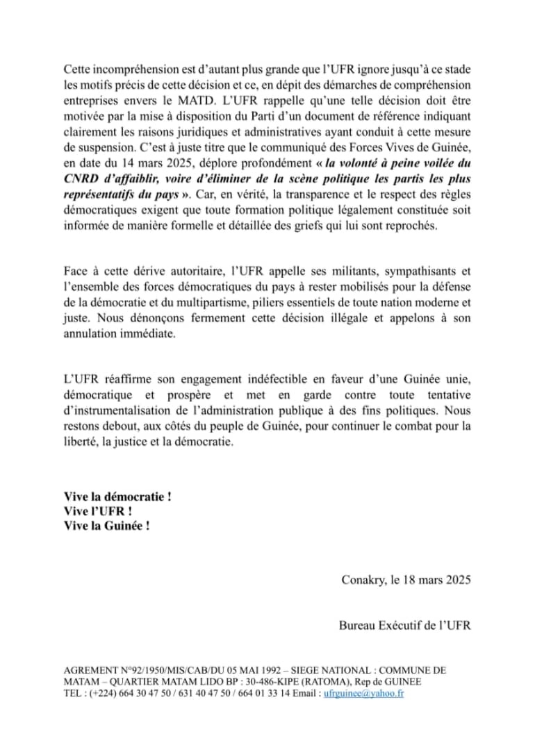 « Nous dénonçons fermement cette décision illégale et appelons à son annulation immédiate.L’UFR réaffirme son engagement indéfectible en faveur d’une Guinée unie, démocratique et prospère et met en garde contre toute tentative d’instrumentalisation de l’administration publique à des fins politiques. Nous restons debout, aux côtés du peuple de Guinée, pour continuer le combat pour la liberté et la justice », a t-il souligné.