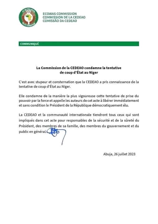 Dans un communiqué parvenu au desk de Siaminfos.com, la Communauté Économique des États de l’Afrique de l’Ouest (CEDEAO), a dénoncé cette tentative de putsch au Niger. D’ores-et-déjà, l’institution sous-régionale exige la libération du président de la République et toutes les personnes arrêtées. Ci-dessous, ledit communiqué !