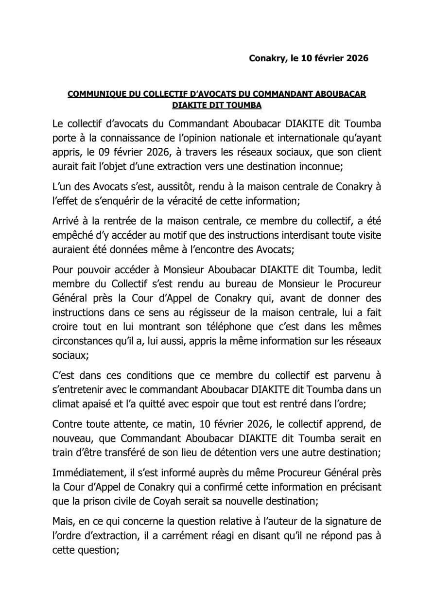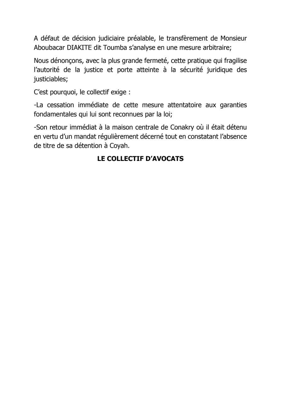 Le collectif exige par conséquent « la cessation immédiate de cette mesure attentatoire aux garanties fondamentales » et le « retour immédiat » de Toumba à la maison centrale de Conakry, faute de quoi sa détention à Coyah serait dépourvue de titre légal.