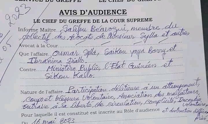 Dans cet avis d’audience, il est indiqué que la première audience dans le dossiers de ces opposants au troisième mandat d’Alpha Condé est programmé pour le 16 mai prochain à la Cour Suprême.