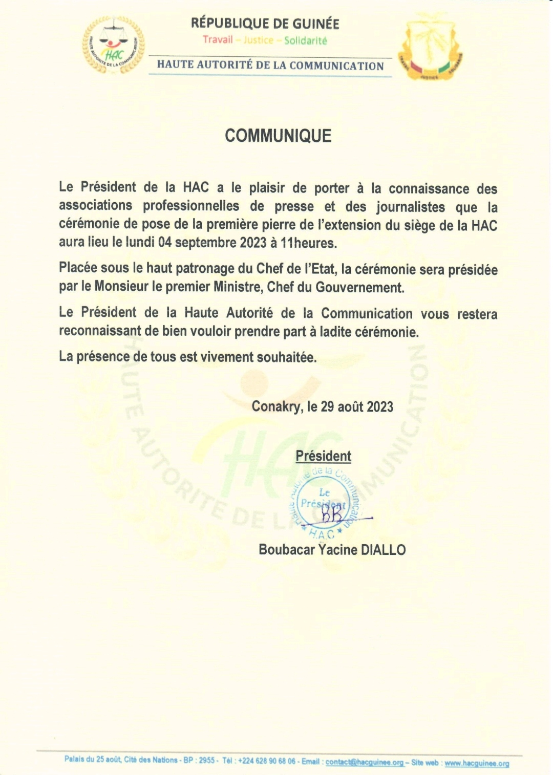 A travers un communiqué en date du 29, août 2023, le Président de la HAC a porté à la connaissance des associations professionnelles de presse et des journalistes que la cérémonie de pose de la première pierre de l’extension du siège de la HAC aura lieu le lundi 04 septembre 2023 à 11heures.