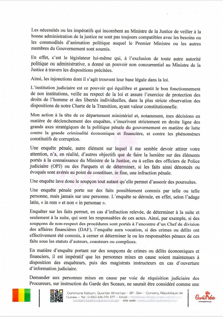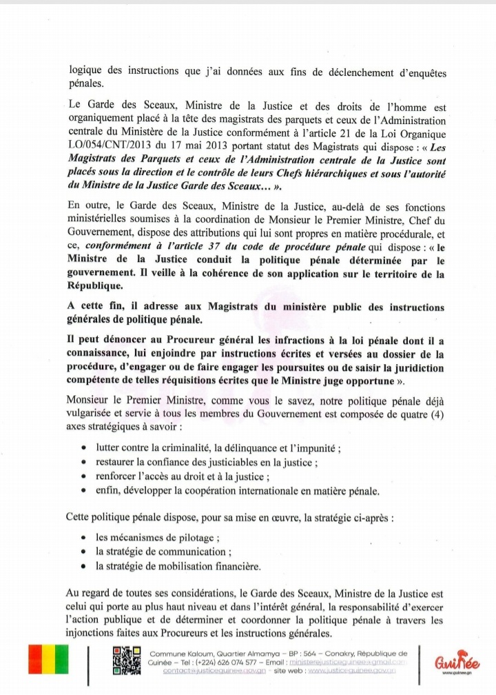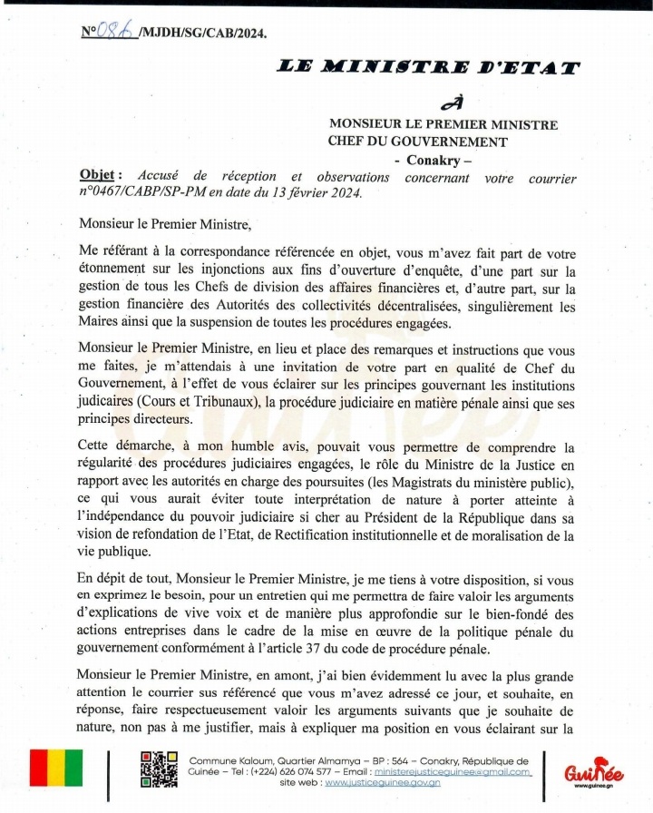 Dans un courrier adressé au chef du gouvernement Dr Bernard Goumou et dont copie est parvenue au desk de Siaminfos.com dans la nuit de ce mardi, 13 février 2024, Alphonse Charles Wright a laissé entendre qu’il est bien dans son rôle. En effet, l’ancien procureur général a rappelé au Premier ministre que « L’action publique ne peut être ni interrompue, ni suspendue ou éteinte par l’instruction du pouvoir exécutif ». Ci-dessous, l’intégralité dudit courrier !