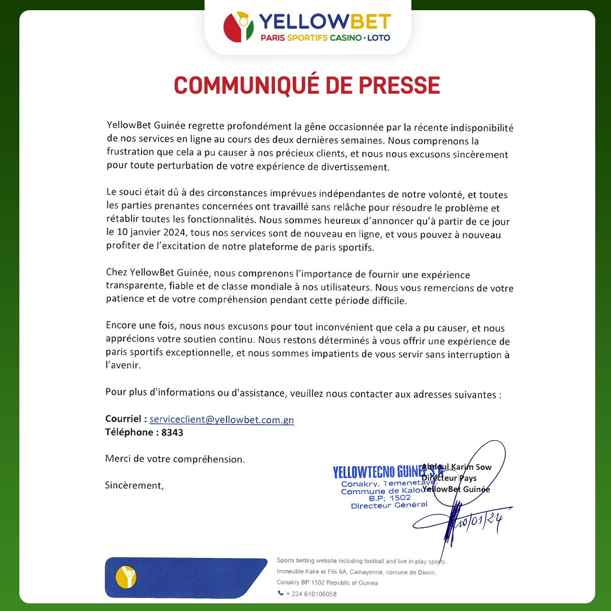Jeux de hasard en Guinée : après deux semaines d’indisponibilité, YellowBet annonce la reprise de ses services en ligne